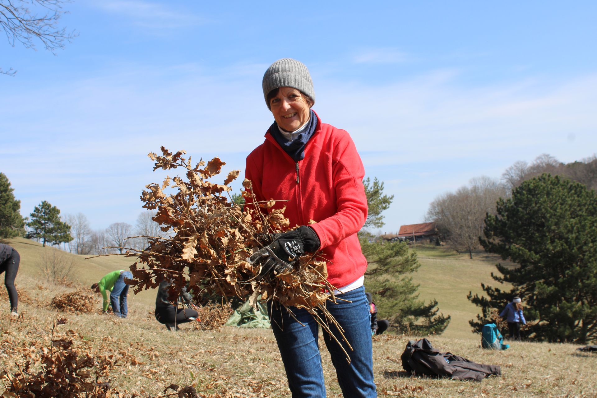 Wir schneiden und hacken gemeinsam Buschaustriebe, Büsche und Bäume und entfernen in ausgewählten Bereichen, die nicht beweidet werden können, den über Jahre entstandenen Grasfilz.